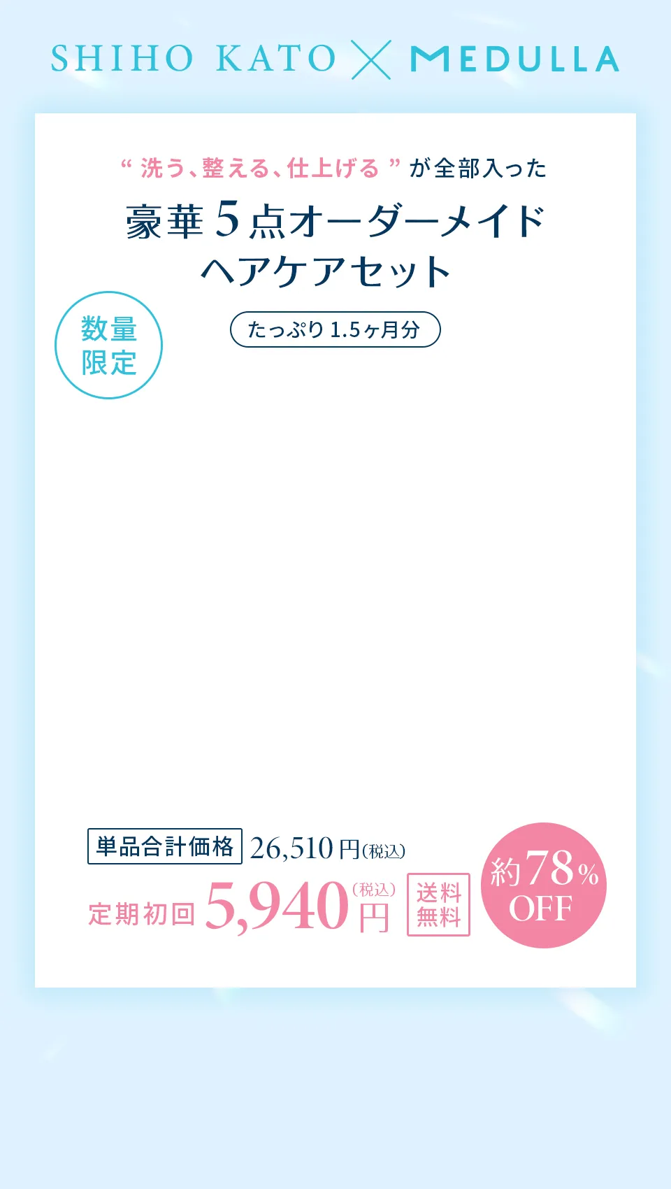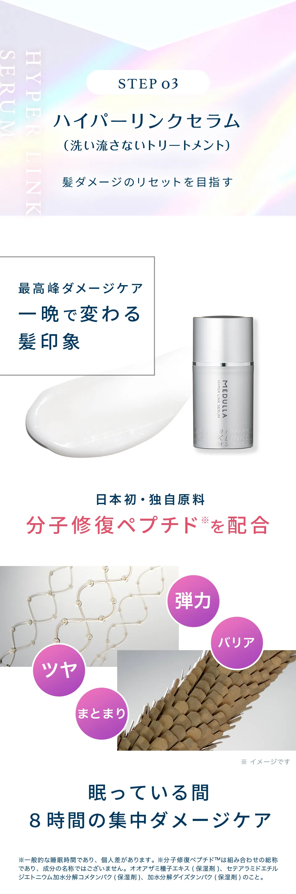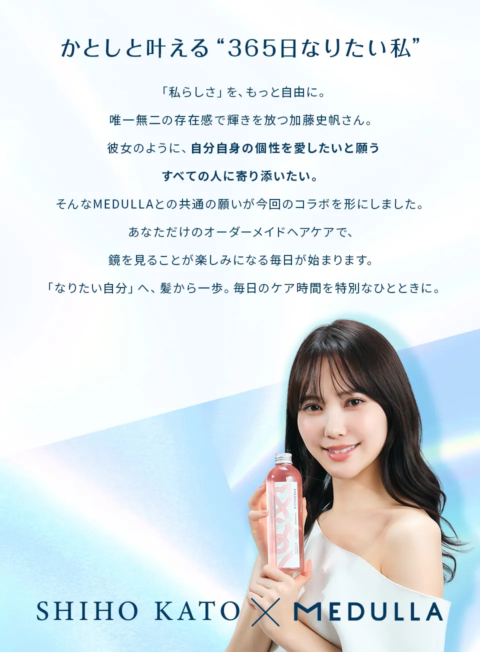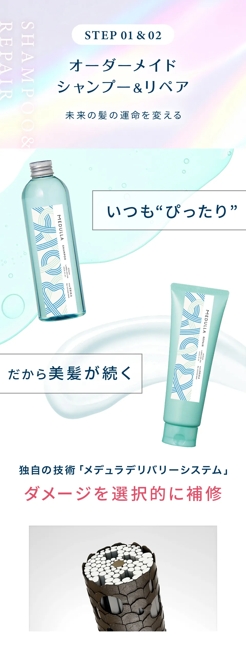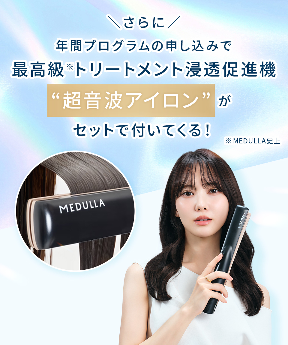 MEDULLAの処方について お客様の髪悩みや目指す仕上がりに応じて、最適な処方を提案するパーソナライズ設計です。代表的なヘアケア成分やうるおい成分を組み合わせて調整します。 安心してお使いいただくためのフリー処方(不使用成分)も公開しております。 成分の詳細はこちら フリー処方の詳細はこちら